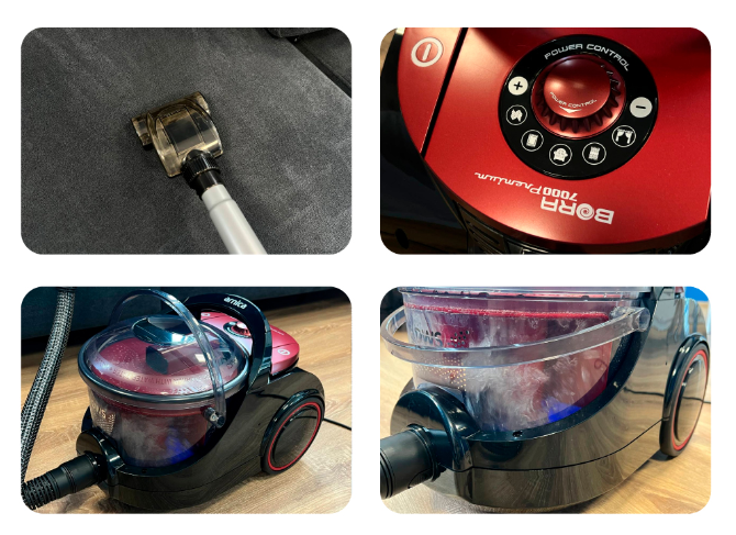 Итак, наш герой установил насадку для мягкой мебели Bora, залил чистую воду в резервуар, выбрал режим «Мягкая мебель» и запустил пылесос.